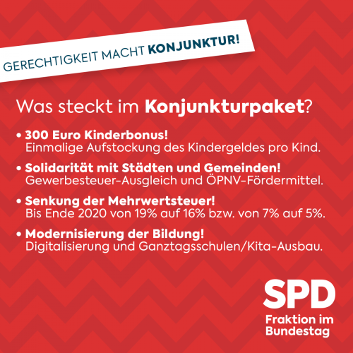 Nach einer zweitägigen Sitzung hat sich der Koalitionsausschuss auf ein großes Konjunkturprogramm geeinigt, mit dem die Wirtschaft durch eine Stärkung der Nachfrage sowie durch Zukunftsinvestitionen wieder in Gang gebracht werden soll. Die Handschrift der SPD ist dabei deutlich zu erkennen, da das Programm ...