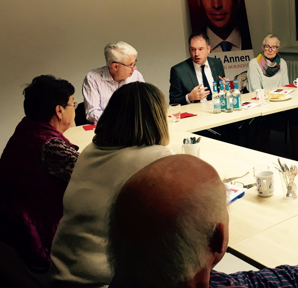 So lud mich die AG 60plus der SPD Eimsbüttel am 06. November zu einer abendlichen Diskussionsveranstaltung anlässlich der „Halbzeit im Bundestag“ ein. Bei selbstgebackenen Butterkuchen und Kaffee wurde angeregt diskutiert. Es herrschte Einigkeit, dass die SPD bisher die Legislaturperiode entscheidend geprägt hatte. Ich berichtete im Anschluss von meinen außenpolitischen Reisen, unter anderem nach Saudi Arabien und in den Iran, und den Zusammenhängen der dort geführten Verhandlungen mit der Flüchtlingspolitik.