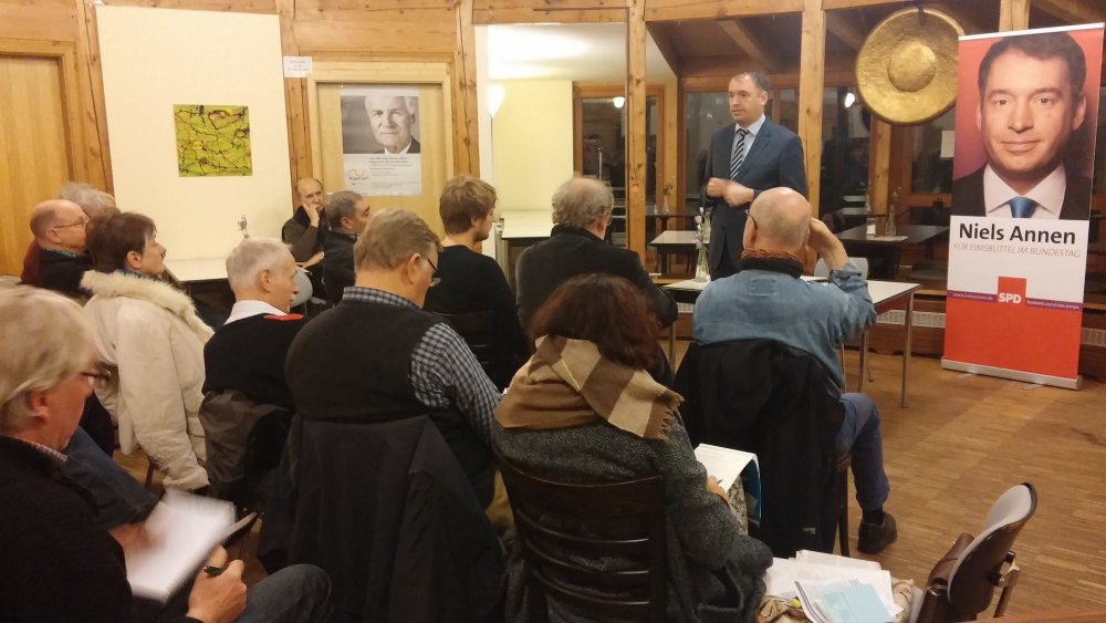 Nachdem ich kurz meine Arbeit im Bundestag und die Halbzeitbilanz der SPD in der großen Koalition vorgestellt habe, kam das Gespräch schnell auf die jüngsten außenpolitischen Entscheidungen. Zentrales Thema waren die Krisen und Kriege im Nahen Osten und natürlich das kurz zuvor beschlossene Syrien-Mandat im Bundestag. Die Bürgerinnen und Bürger diskutierten sehr lebhaft und kritisch mit mir. Nicht alle waren mit dem Einsatz der Bundeswehr in Syrien einverstanden. Vor den gefüllten Stuhlreihen erläuterte ich die Gründe für die Zustimmung der Regierung und dem Großteil der SPD-Fraktion. Außerdem diskutierten wir kontrovers die Zusammenhänge mit den Fluchtursachen, die Finanzierung des IS und die Wechselwirkungen zwischen den verschiedenen Staaten im Nahen Osten.
