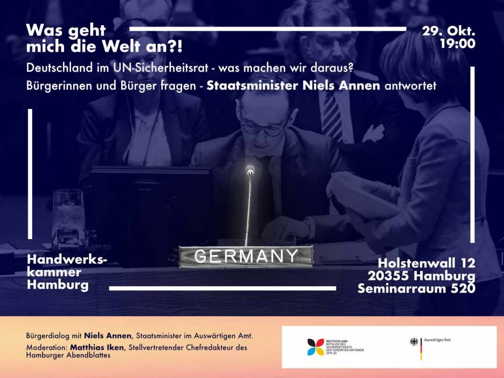 Die nächste Veranstaltung findet unter dem Titel "Deutschland im VN-Sicherheitsrat - was machen wir daraus?" in Hamburg statt. Dabei werde ich die Fragen interessierter Bürgerinnen und Bürger beantworten und von meinen persönlichen Erfahrungen aus New York berichten.