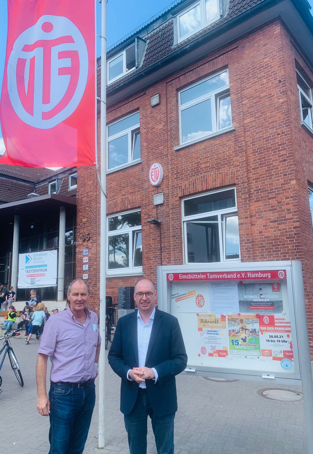 Wieder zurück über die Fruchtallee am Isebekkanal ist der Eimsbütteler Turnverband – kurz ETV - beheimatet. Dieser gehört zu den größten Breitensportvereinen in Deutschland. Beim Austausch mit Frank Fechner und Markus Grandjean stand die Frage im Mittelpunkt, wie die Vereinslandschaft nach den schwierigen Corona-Monaten mit teilweise erheblichen Mitgliederrückgängen wieder in Schwung kommt. Dabei ist das neue Programm der Stadt SportVEREINtuns, über das 20.000 Gutscheine in Höhe von 80 € für Neumitgliedschaften bereitgestellt werden, ein wichtiger Baustein. Der ETV errichtet zudem am Lokstedter Steindamm das wohl größte gemeinnützige Sportinfrastrukturprojekt Deutschlands, das jetzt auf die Zielgerade geht. Ab Oktober soll dann mit Sport-, Kita- und Freizeitnutzung an diesem tollen Standort gestartet werden.