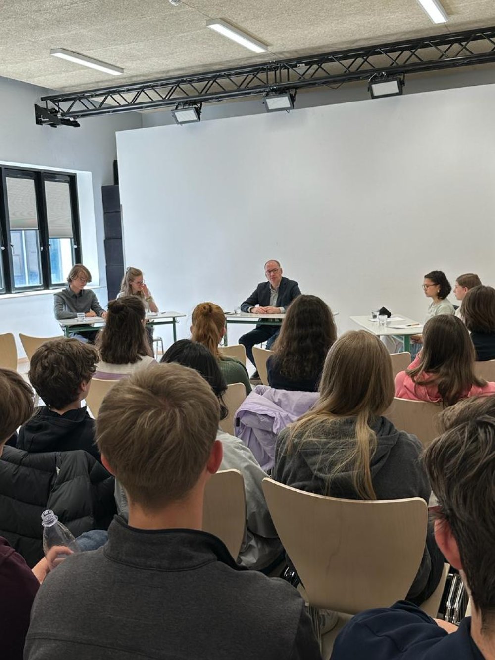 Am darauffolgenden Tag war ich zu einer Podiumsdiskussion mit Schüler:innen der Mittel- und Oberstufe des Sophie-Barat-Gymnasiums eingeladen. Das Engagement und Interesse der Schüler:innen heutzutage beeindruckt mich immer sehr. Die Schüler:innen hatten vier Mitschüler:innen auserkoren, die mit mir auf dem Podium saßen und mir zu verschiedenen Themen sehr detaillierte Fragen stellten. Natürlich waren die aktuellen politischen Themen vertreten, aber auch mein Weg in die Politik und meine Meinung zu gesellschaftlichen Themen standen auf der Tagesordnung. Eine Doppelstunde hat am Ende knapp gereicht, um den Wissensdurst der Schüler:innen zu stillen. Es hat mich sehr gefreut diese Schule besuchen zu dürfen.