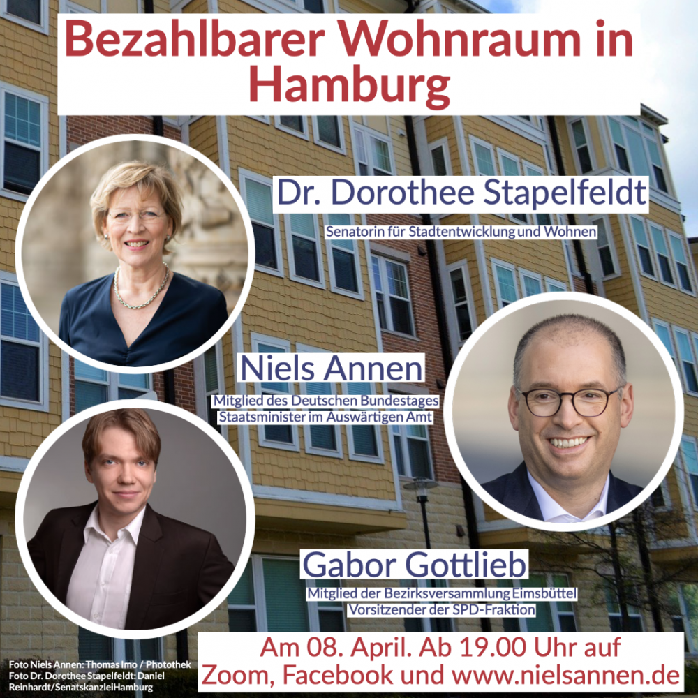 Ich freue mich daher auf ein spannendes Gespräch mit Hamburgs Stadtentwicklungssenatorin Dorothee Stapelfeldt und Gabor Gottlieb, Vorsitzender der SPD-Fraktion Eimsbüttel am Donnerstag, den 8. April 2021 um 19.00 Uhr. Gemeinsam wollen wir über die Lage auf dem Hamburger Wohnungsmarkt sprechen und dabei auf die Anstrengungen eingehen, die es auf Bundesebene, in Hamburg und konkret im Bezirk Eimsbüttel weiter braucht, um hier gut und bezahlbar wohnen zu können.